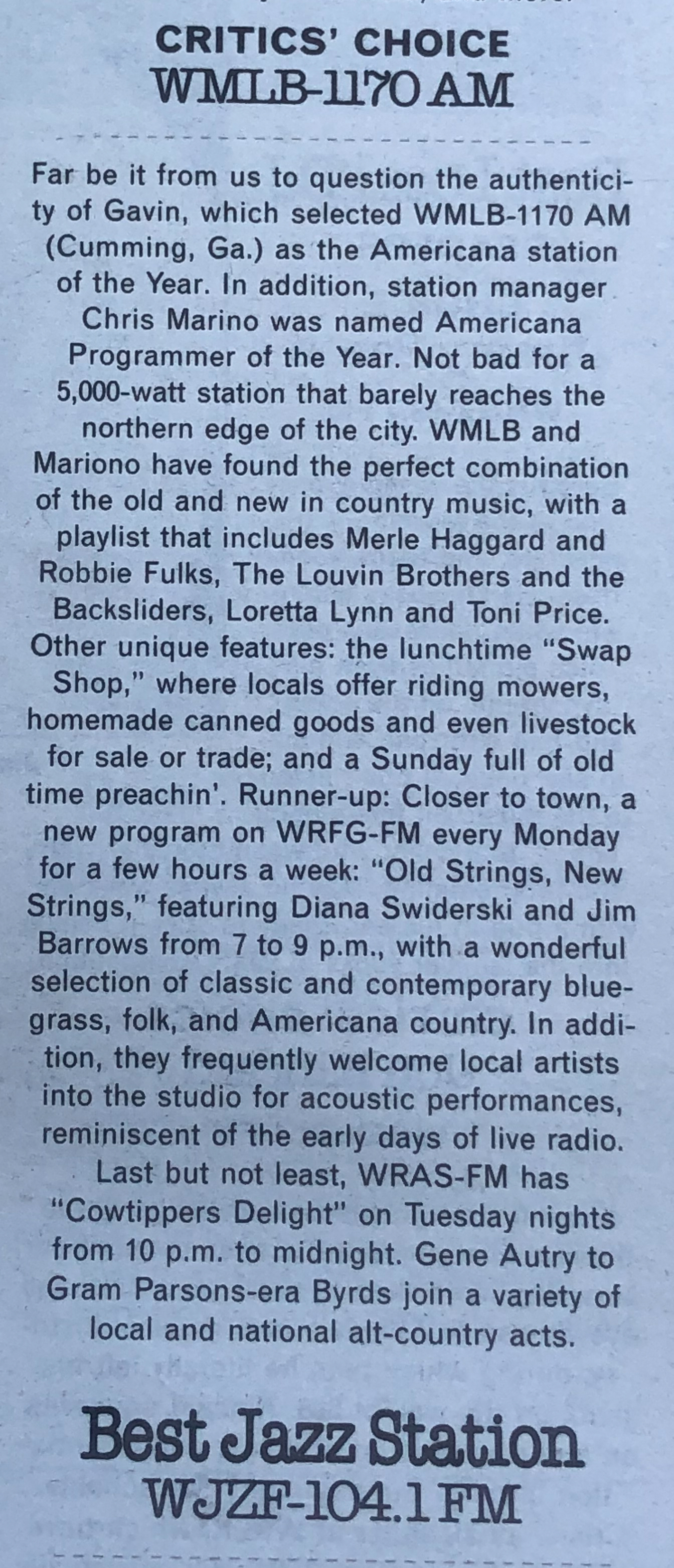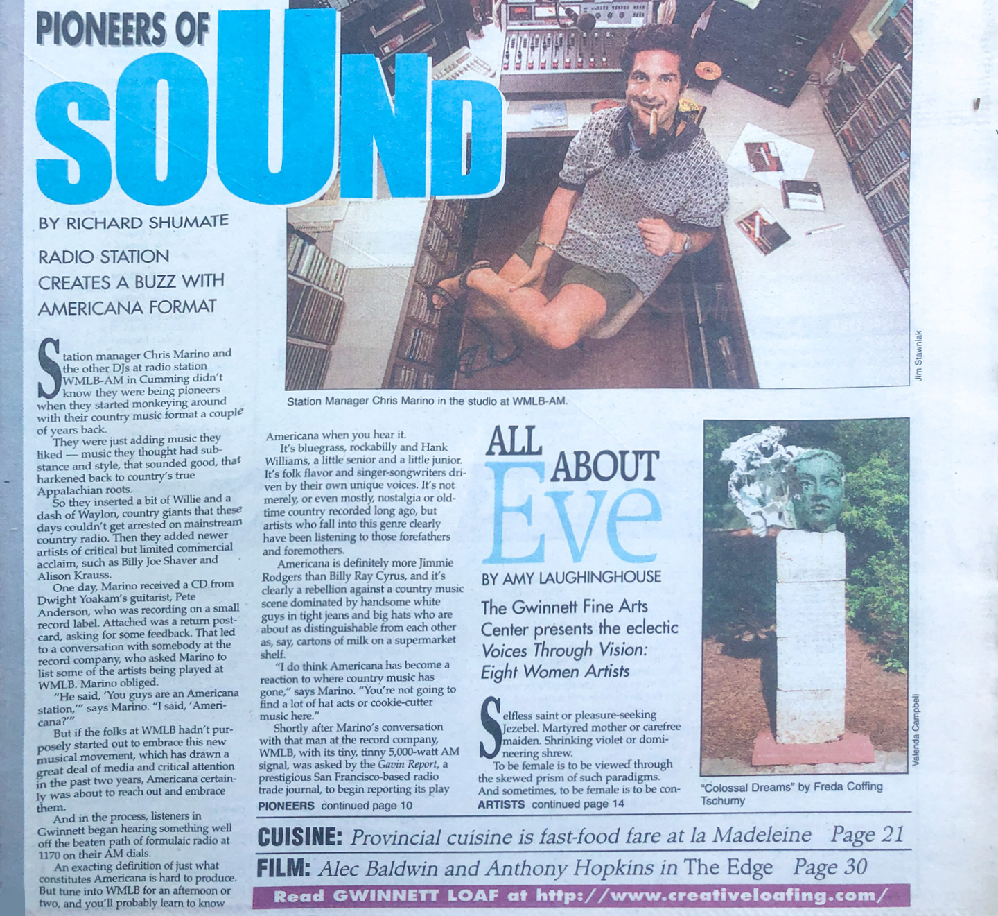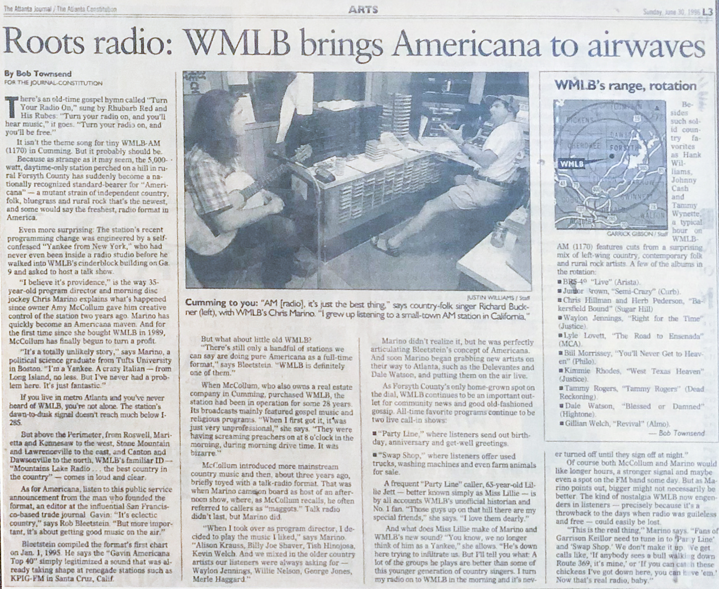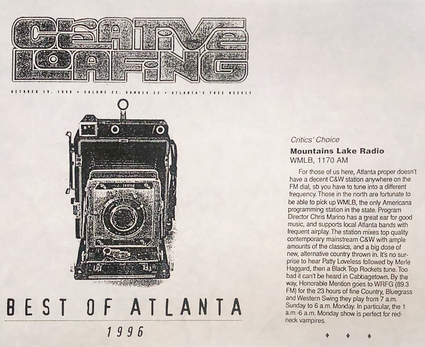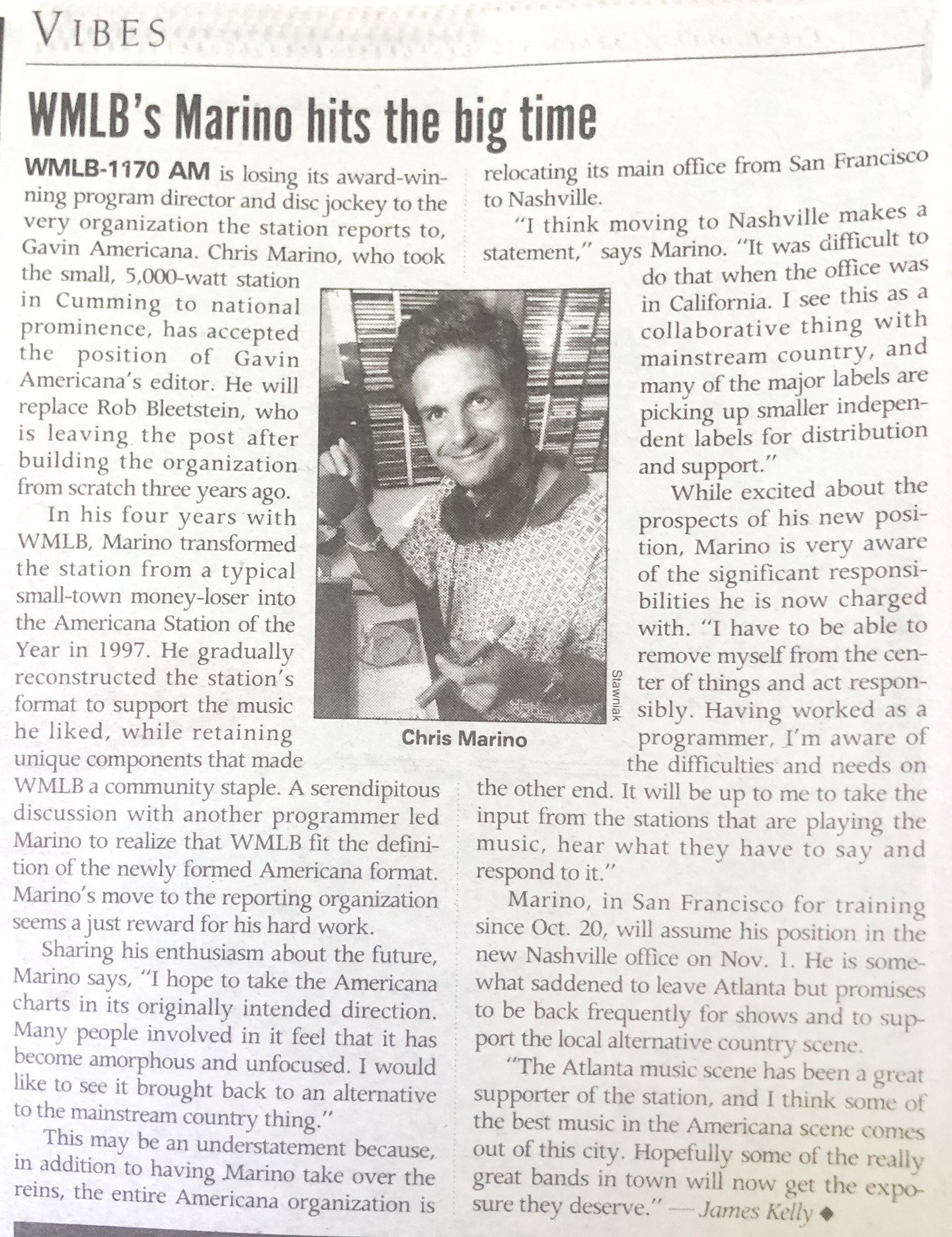 Before his foray into television, Chris Marino arrived at an unprofitable AM radio station on the fringes of Atlanta and in three years he and his dedicated station staff turned WMLB AM 1170 into a profitable nationally recognized Americana Station. WMLB set the standard for the Americana format and went on to win numerous awards including “Americana Station of the Year.”
