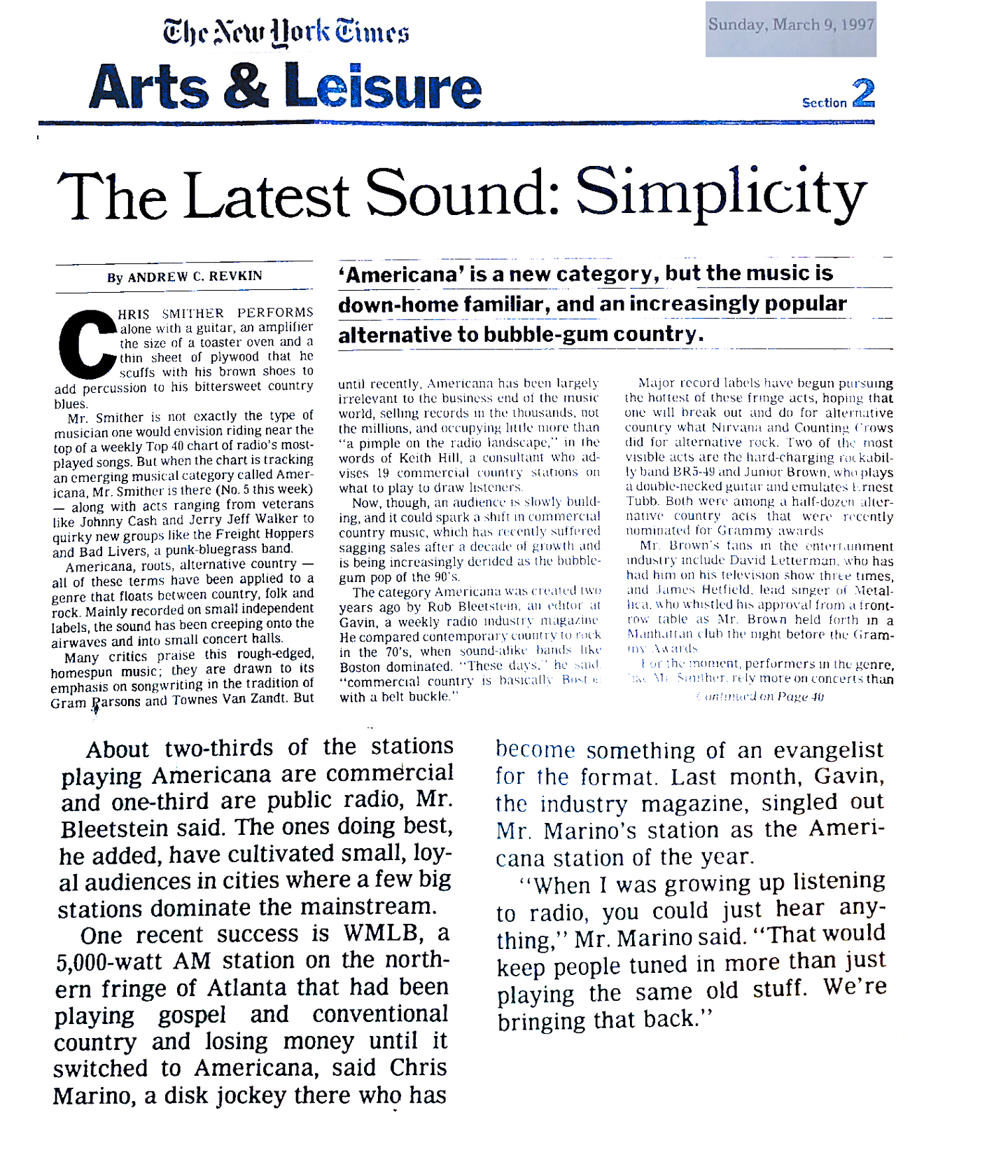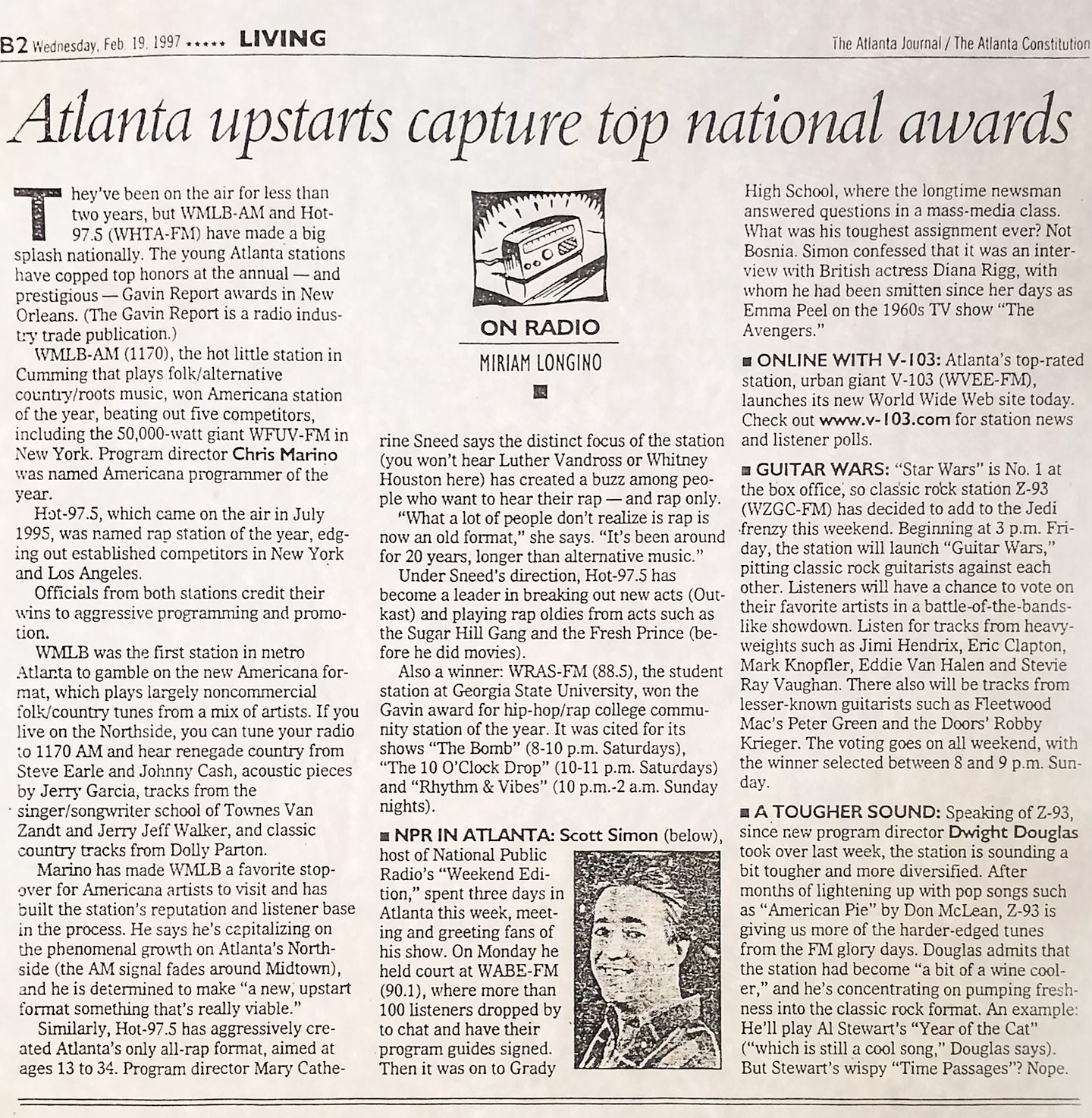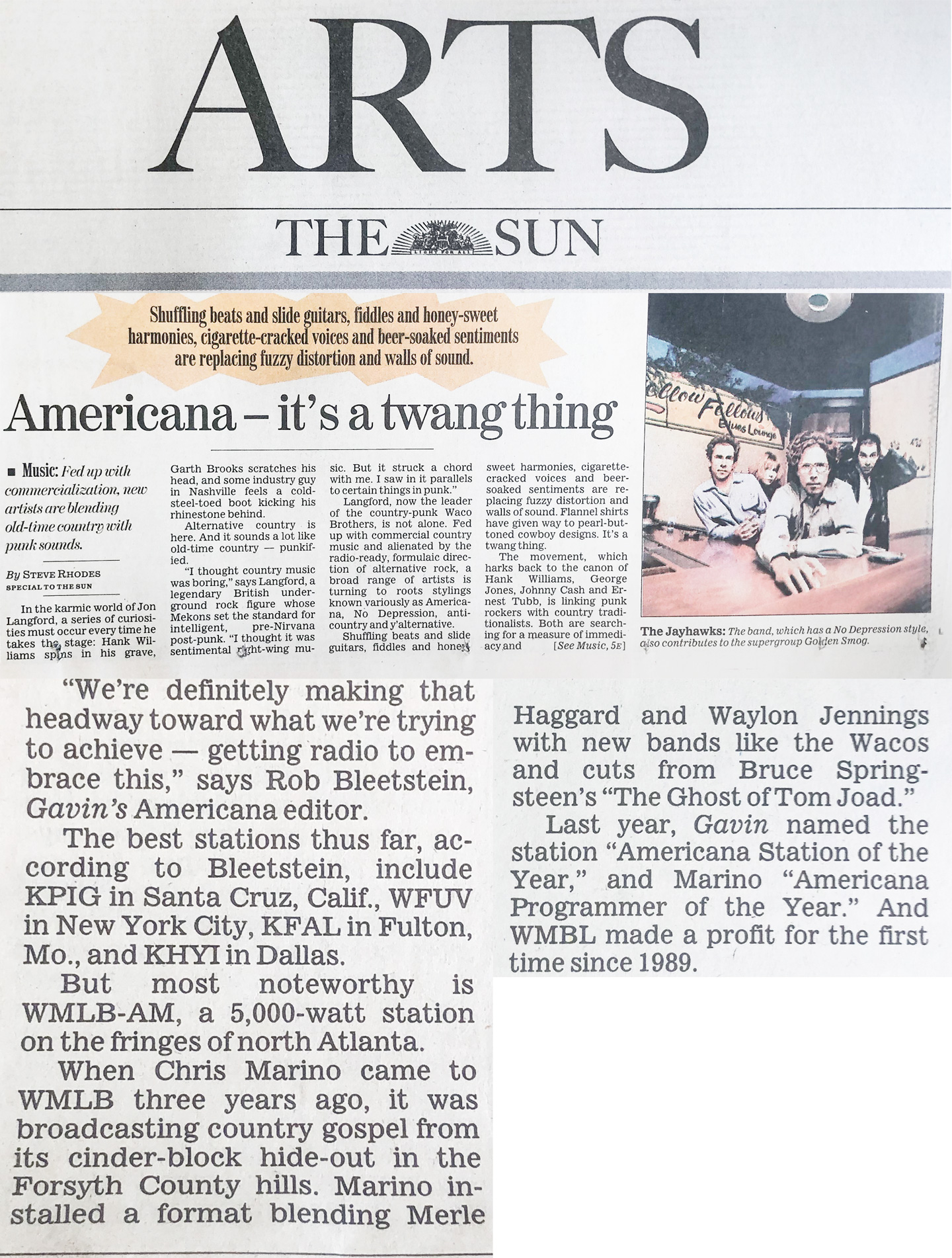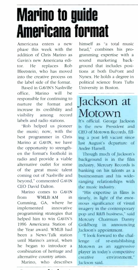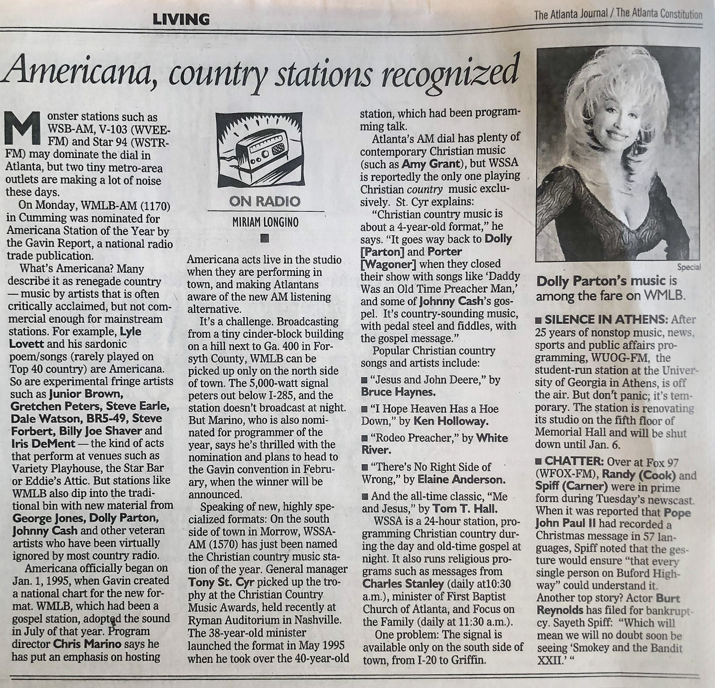 Before his foray into television, Chris Marino arrived at an unprofitable AM radio station on the fringes of Atlanta and in three years he and his dedicated station staff turned WMLB AM 1170 into a profitable nationally recognized Americana Station. WMLB set the standard for the Americana format and went on to win numerous awards including “Americana Station of the Year.”